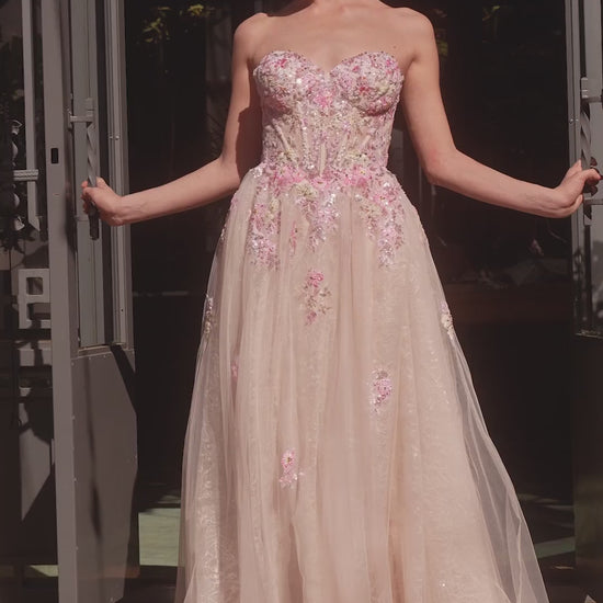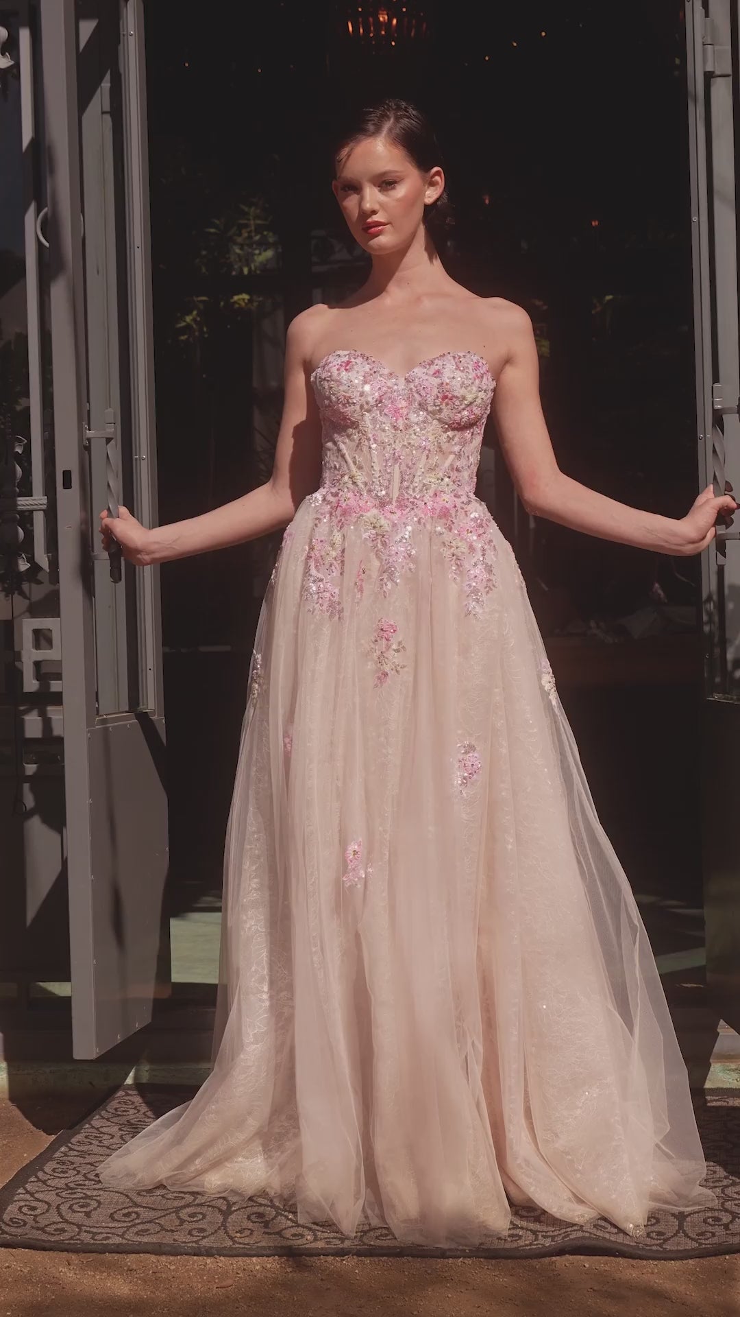 Cette somptueuse robe de bal arbore un décolleté en cœur sans bretelles et un corsage richement orné pour une élégance intemporelle. La jupe en tulle superposé est sublimée par de délicates applications de dentelle florale, créant une silhouette romantique qui accompagne chacun de vos mouvements avec grâce. Grâce à son corsage structuré et son dos corset lacé, cette robe est idéale pour un bal de promo, un gala ou toute occasion formelle où raffinement et sophistication sont de mise.