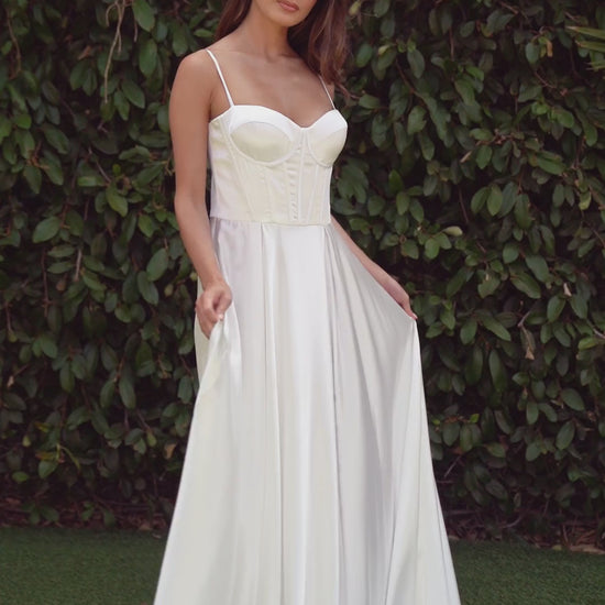 Son corset structuré souligne la taille avec subtilité, tandis que ses fines bretelles ajoutent une note délicate et féminine. La fente élégante dans la jupe apporte un souffle de grâce à chacun de vos pas.
