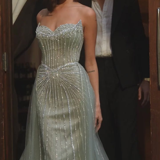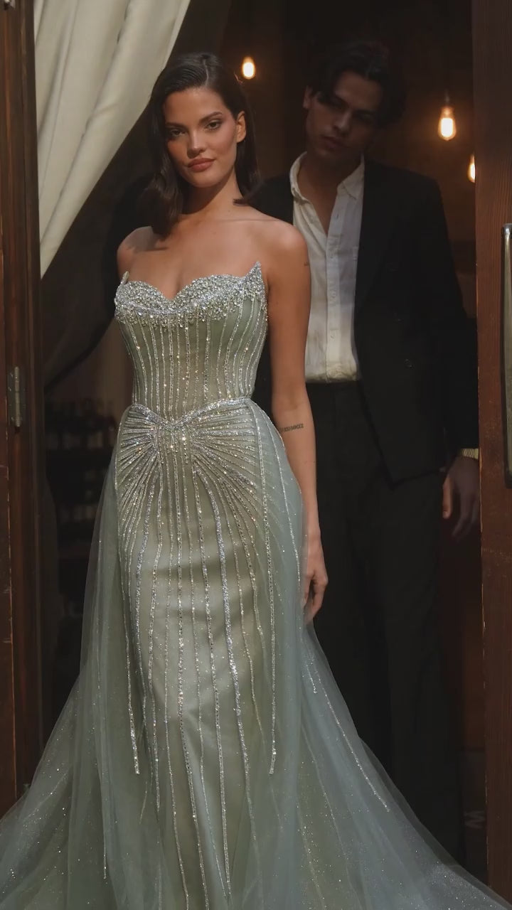Cette robe ajustée sans bretelles brille grâce à ses perles de cristal apportant une touche moderne d'élégance. Le corsage structuré assure maintien et confort, tandis que la sur-jupe en tulle superposée crée une silhouette à la fois dramatique et gracieuse. Parfaite pour un bal de promo, un événement en tenue de soirée ou une première sur le tapis rouge, cette robe incarne sophistication et glamour.